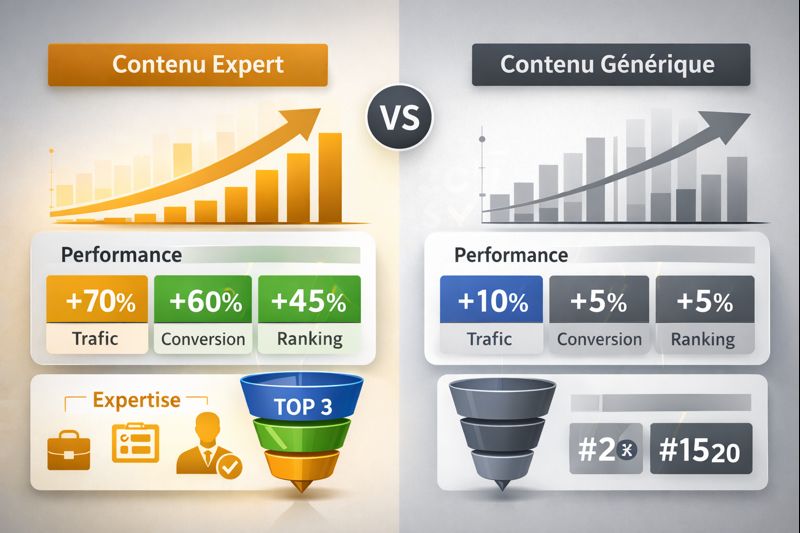 Contenu expert vs générique : données chiffrées sur l’impact réel. Analyse comparative des performances SEO, taux de conversion et ROI. Guide basé sur études sectorielles vérifiables.