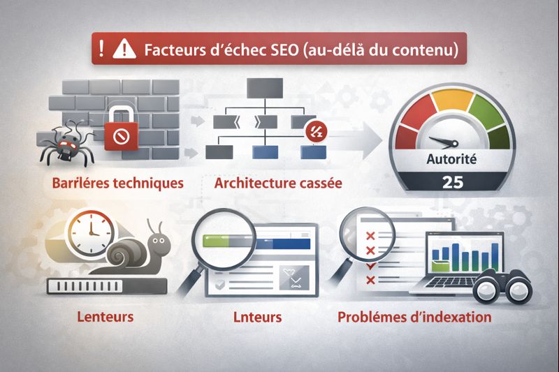Stratégies SEO qui échouent : 7 causes mesurables au-delà du contenu. Analyse technique, autorité, architecture, timing. Données chiffrées sur facteurs bloquants et solutions.